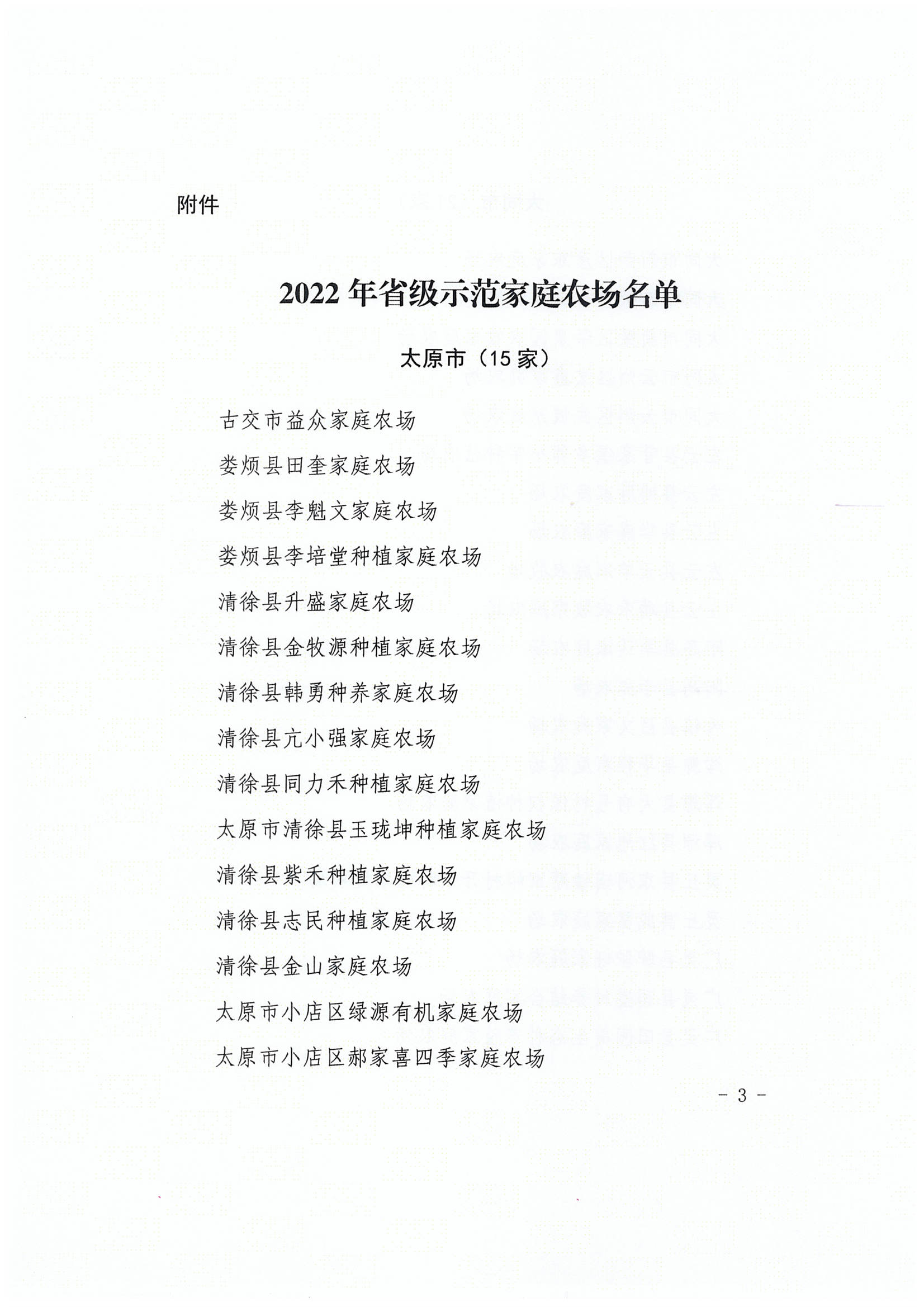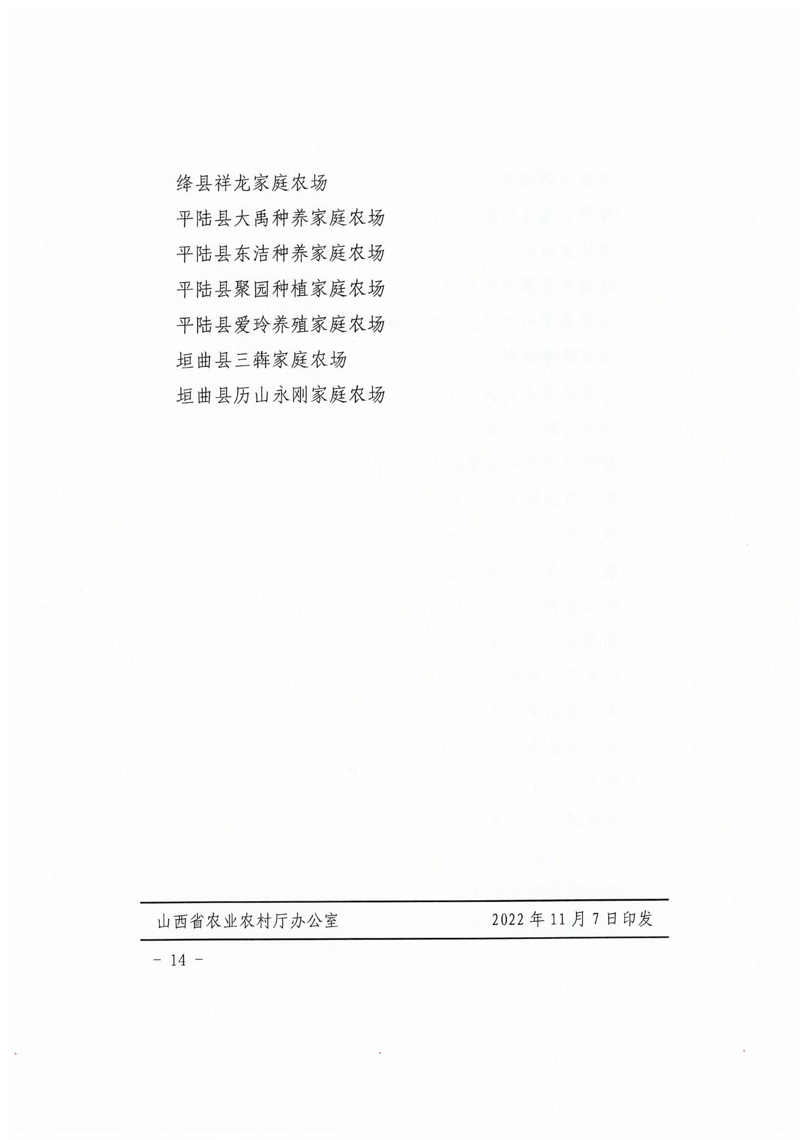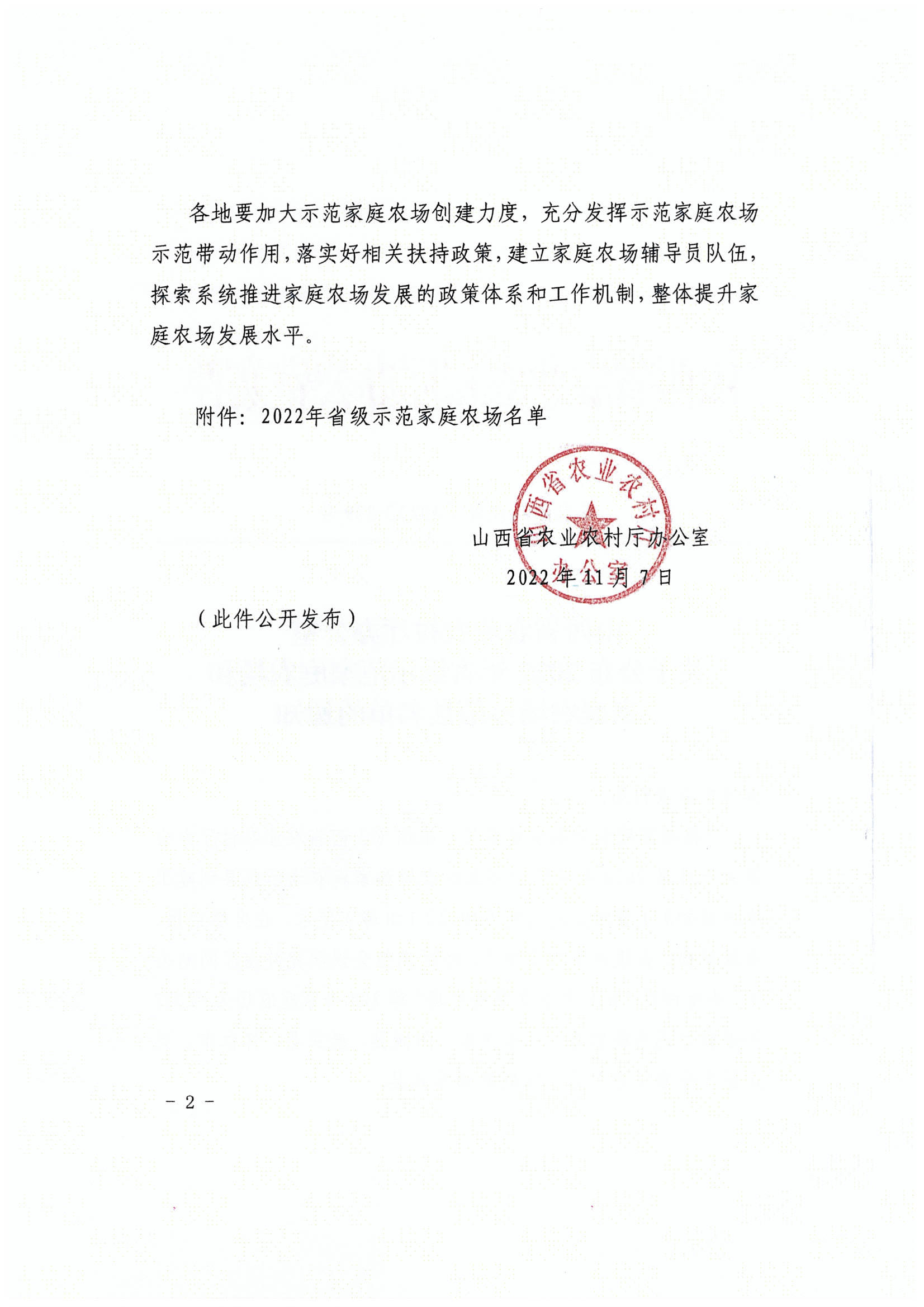 《山西省农业农村厅办公室 关于公布2022年省级示范家庭农场和家庭农场示范县名单的通知》(晋农办政改发〔2022〕229号)